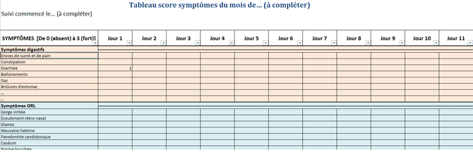 Le tableau score symptômes vous permet de suivre l’évolution de vos symptômes dans le temps, en fonction des changements que vous faites dans votre programme anti-candida ainsi que de certains événements (« je suis à court d’acidophilus », « j’ai attrapé un rhume », etc.).